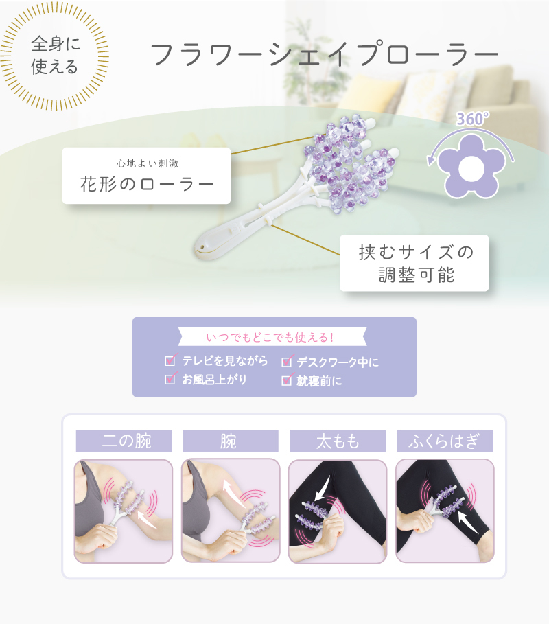 フラワー型のボールで腕や脚を挟んで転がすだけ。