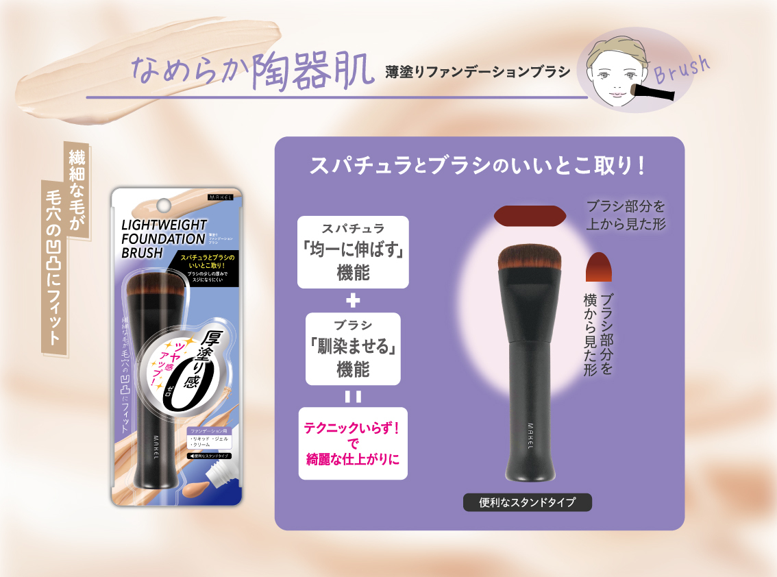 ───── PRODUCT INFO ───── スパチュラ発想の素肌感を作るファンデーションブラシ! スジむらにならないよう 少し厚めの薄型,毛足は少し短めに設計。 滑らせた瞬間、ファンデーションが極薄均一に伸びます。 カラー:全1種類 内容量:1コ 品番 :MSB1401 サイズ:W72×H170×D32